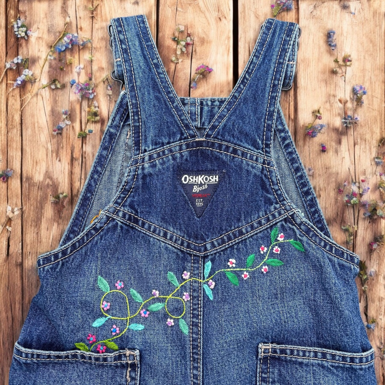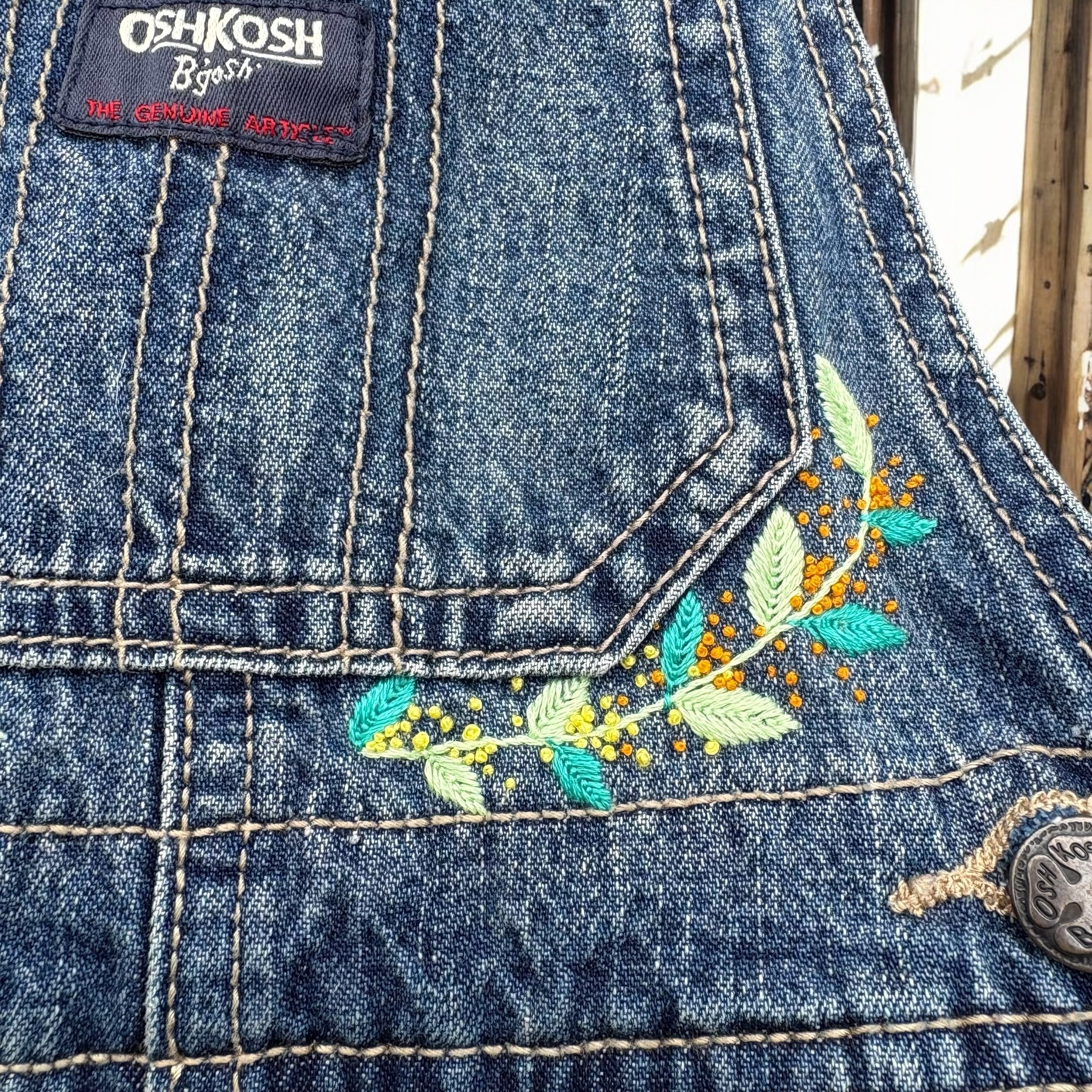 シンプルなオシュコシュオーバーオールに春らしいカラフルな刺繍とビーズを施したリメイクアイテムです!