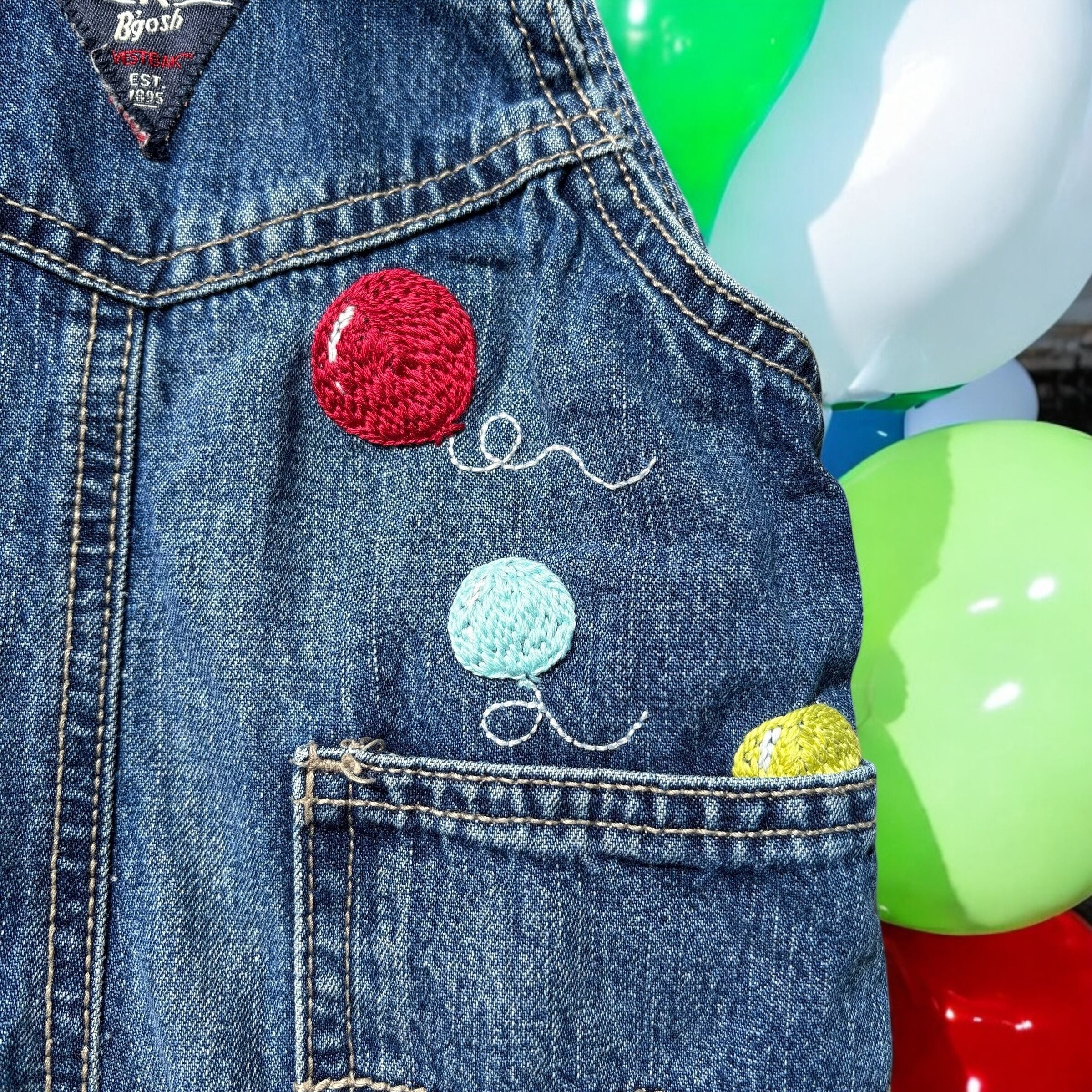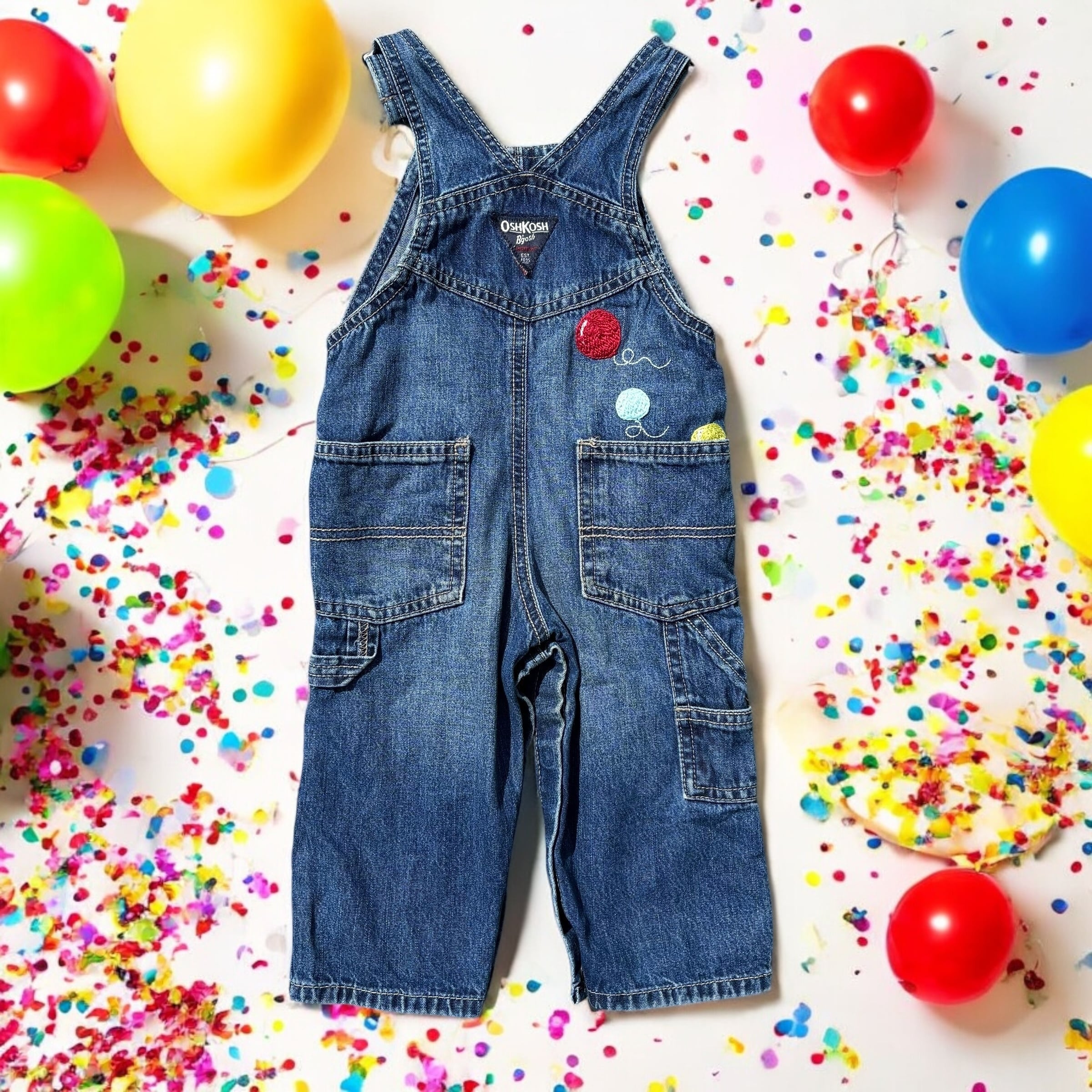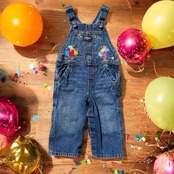 シンプルなオシュコシュオーバーオールにカラフルな刺繍を施したリメイクアイテムです!