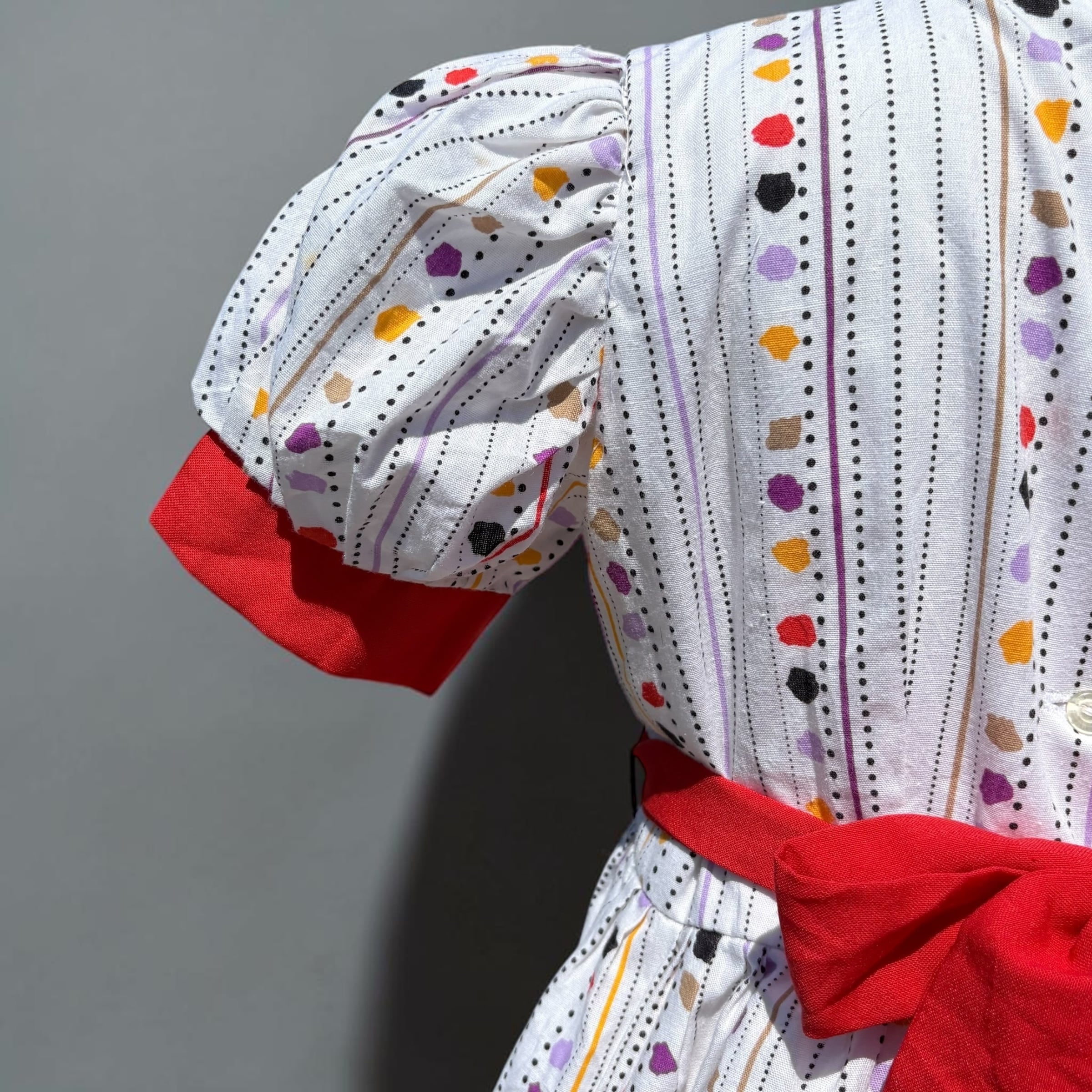 ホワイトベースに赤のウエストリボンが映える、ヴィンテージのハンドメイドワンピースです。