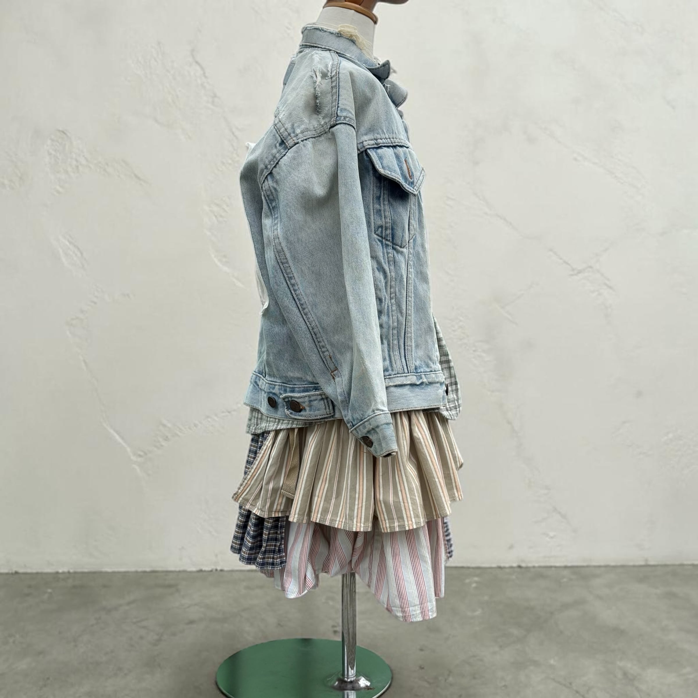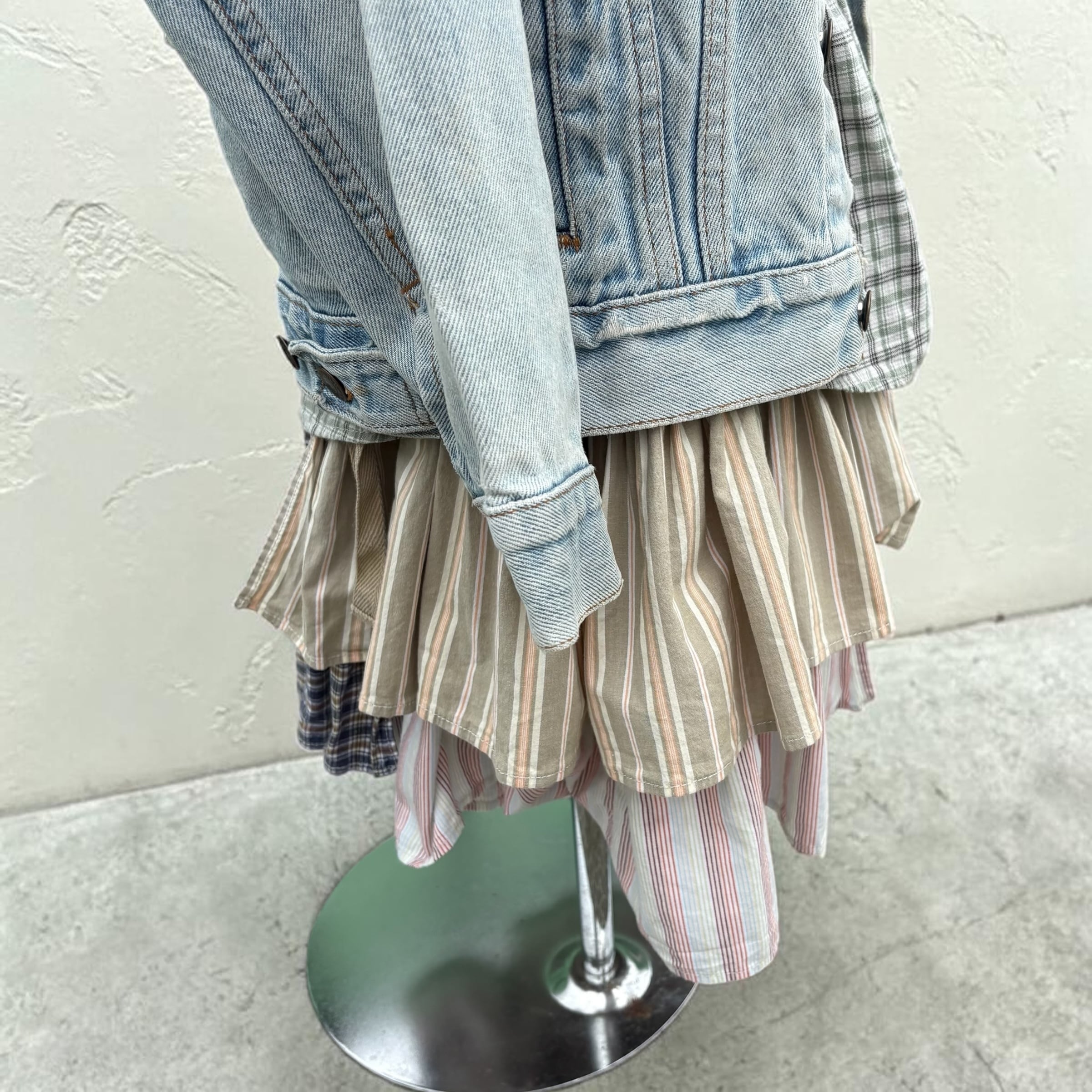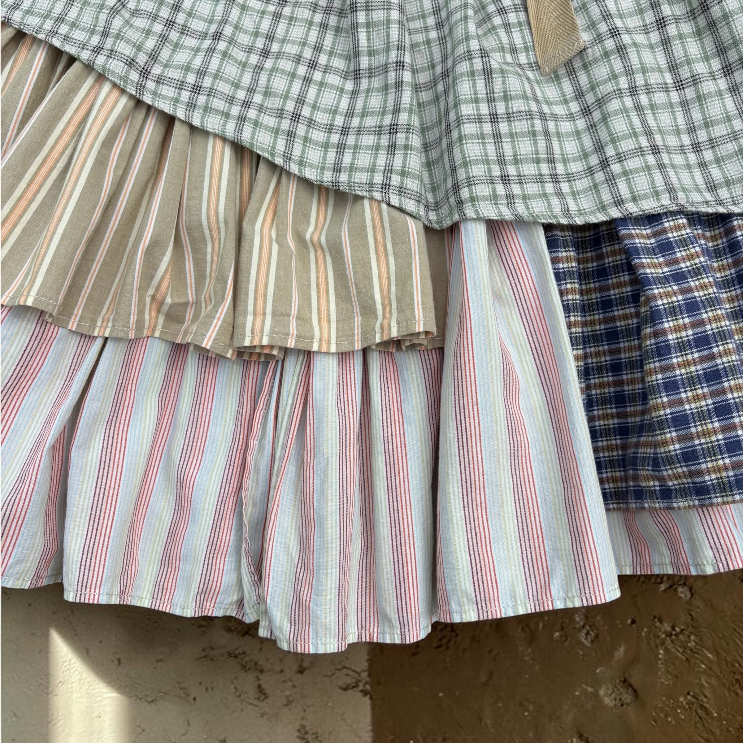 チェック柄やストライプ生地を組み合わせた、立体感のあるデザインが特徴の1着。