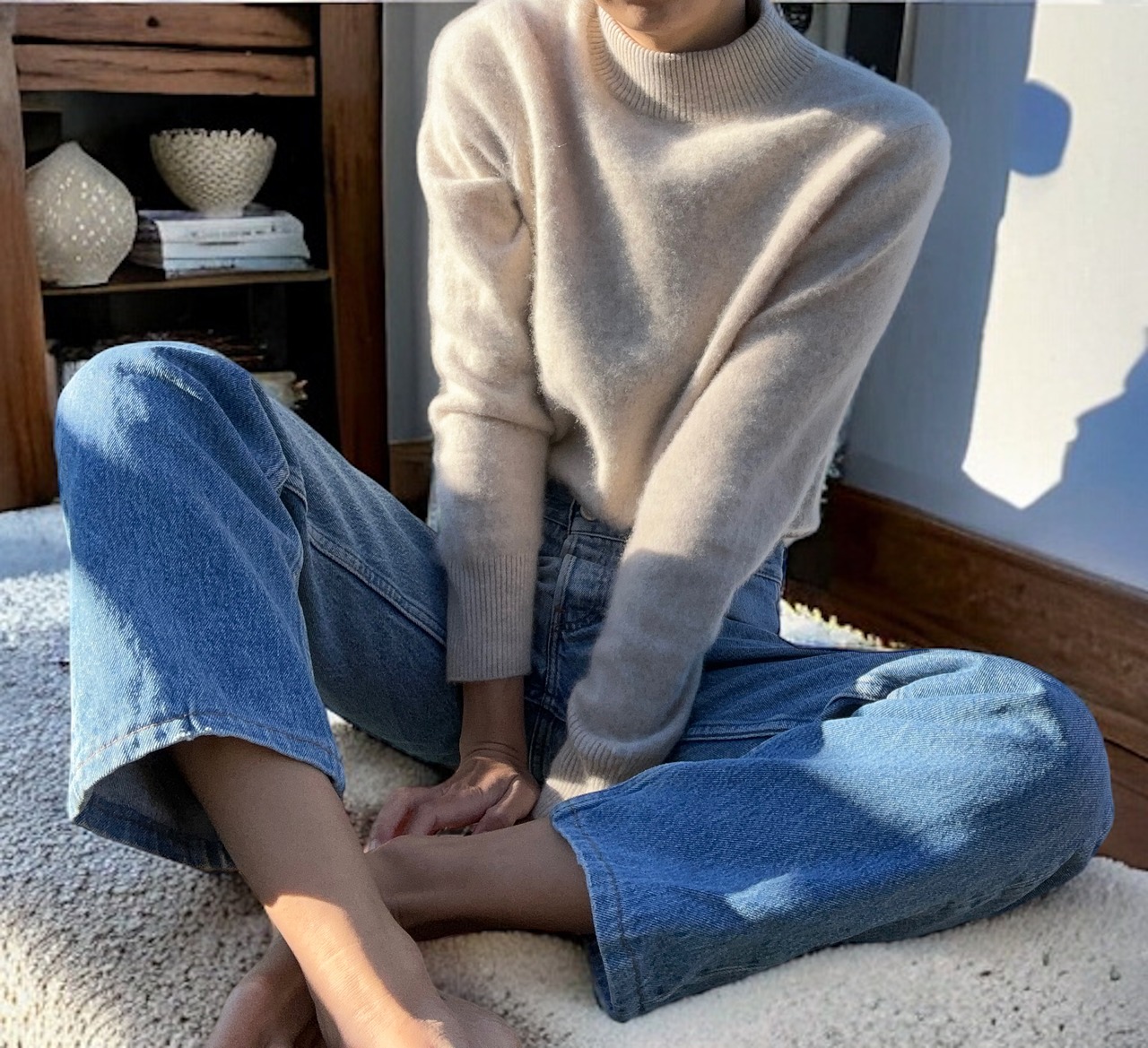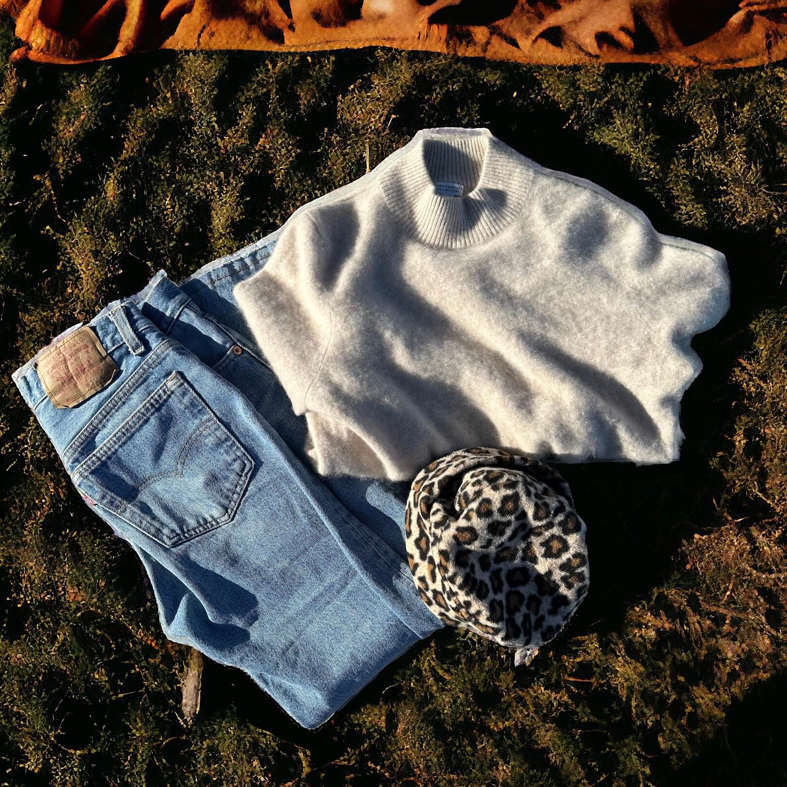 着用トップス: Cashmere knit/Mickey mouse fleece tops/NIKE big sweat (すべて販売中)