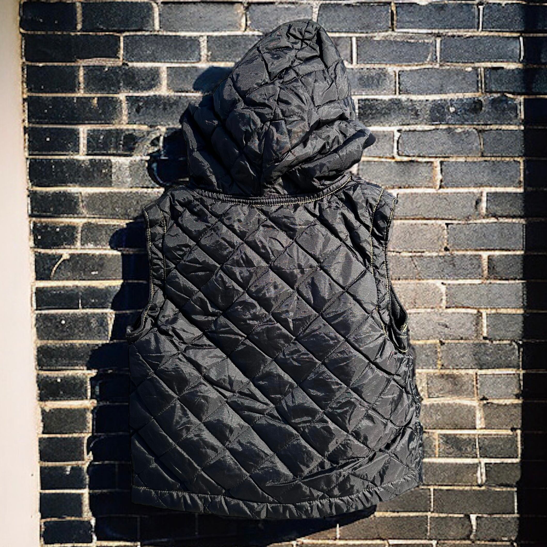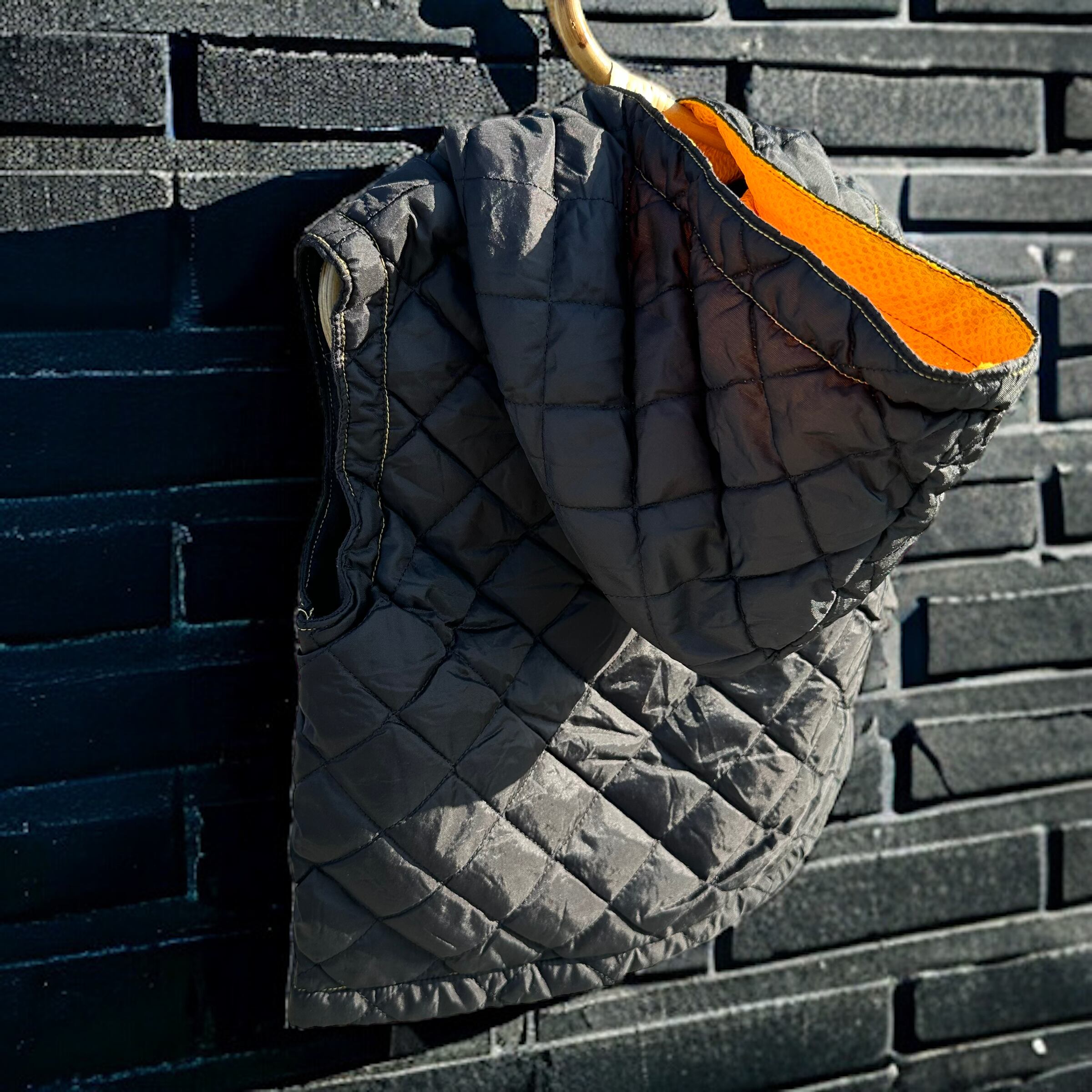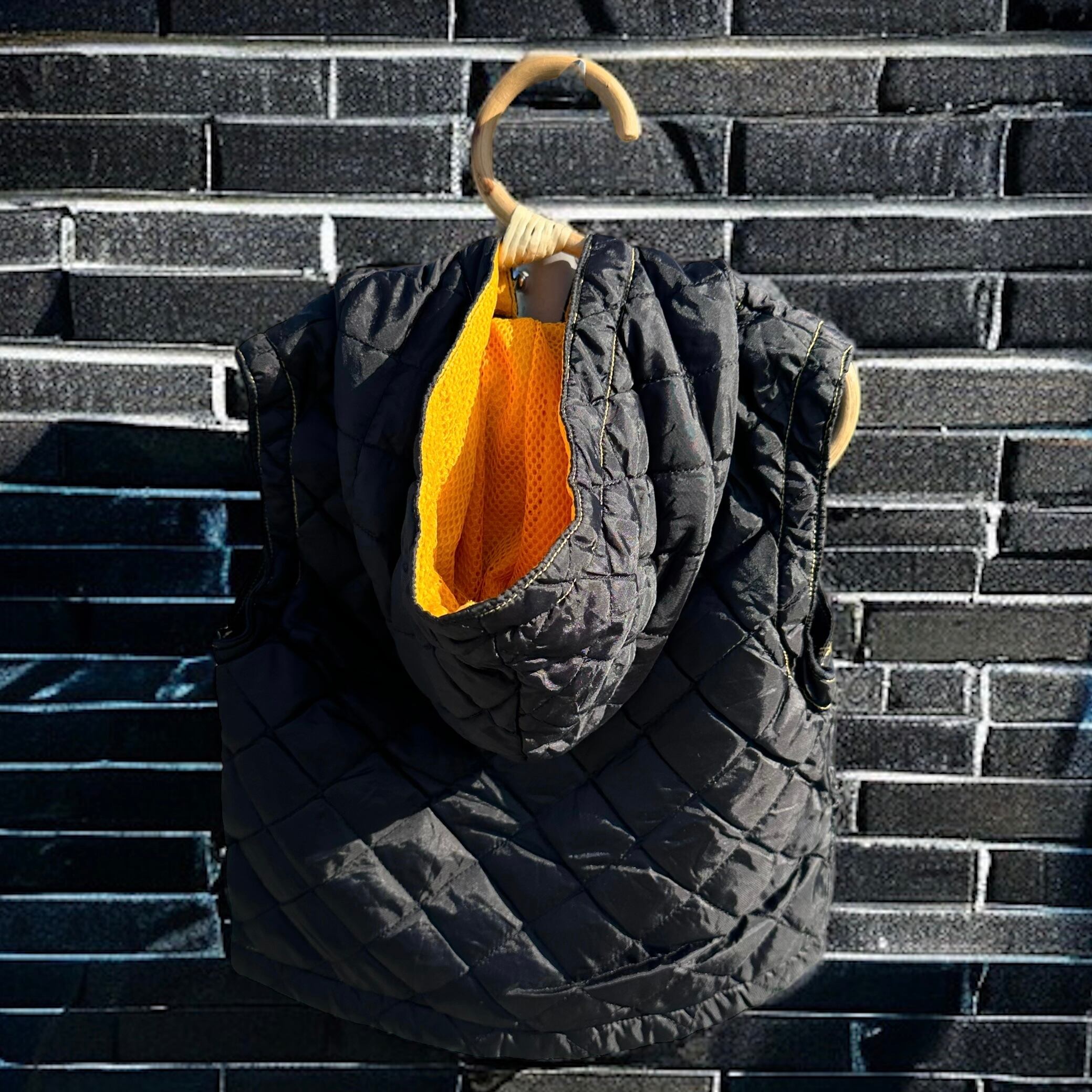 黄色のフェルトロゴが目立つ、キルティングの薄手ダウンベストです!