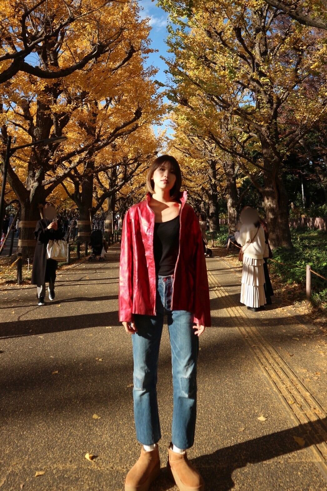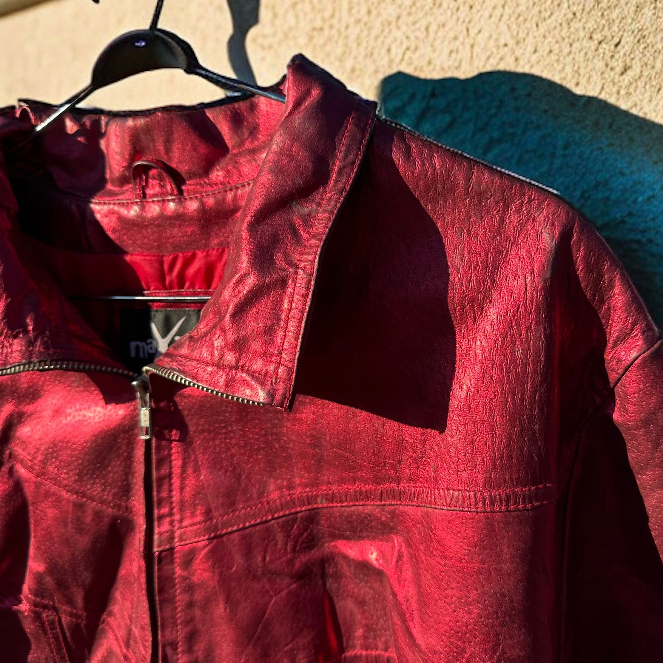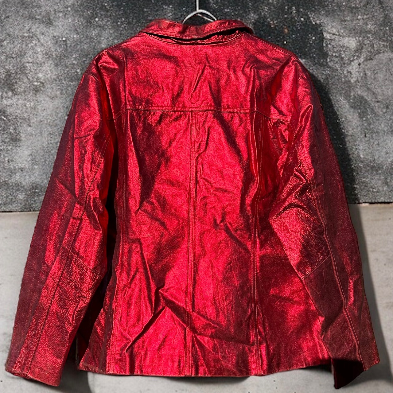 光沢のある赤で、一枚で存在感が出るレザージャケットです!