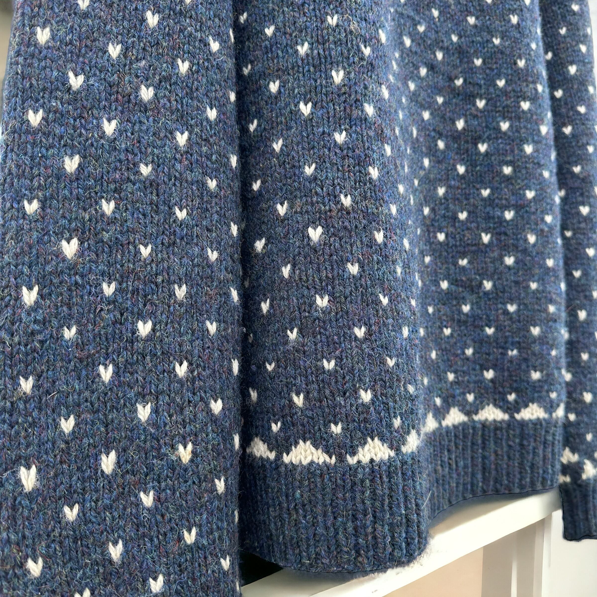しっかりとした作りのネイビーのニットカーディガンですが、よく見るとカラフルな糸が一緒に編み込まれている為明るさや光の加減によりまた少し違った見え方になる不思議なニットです!