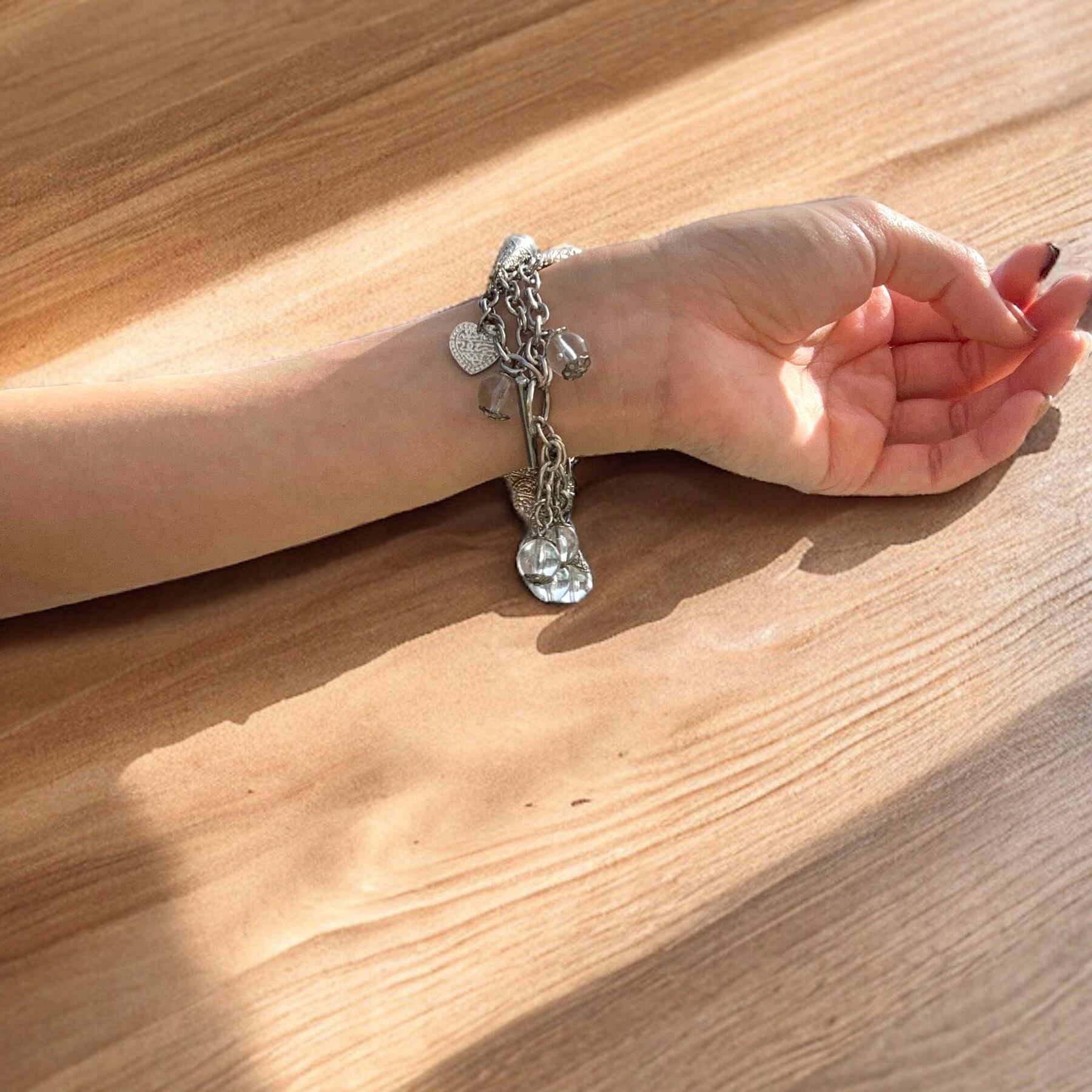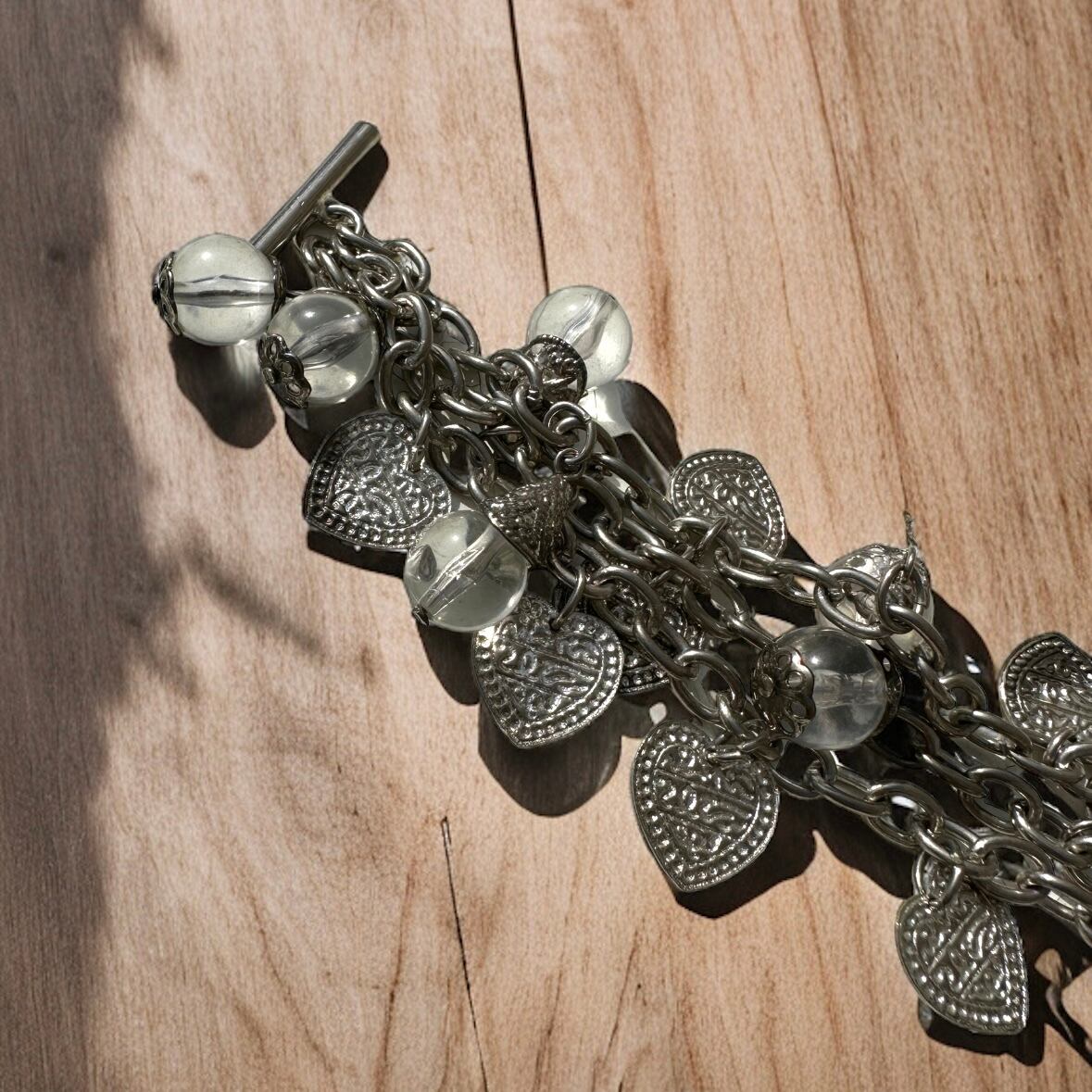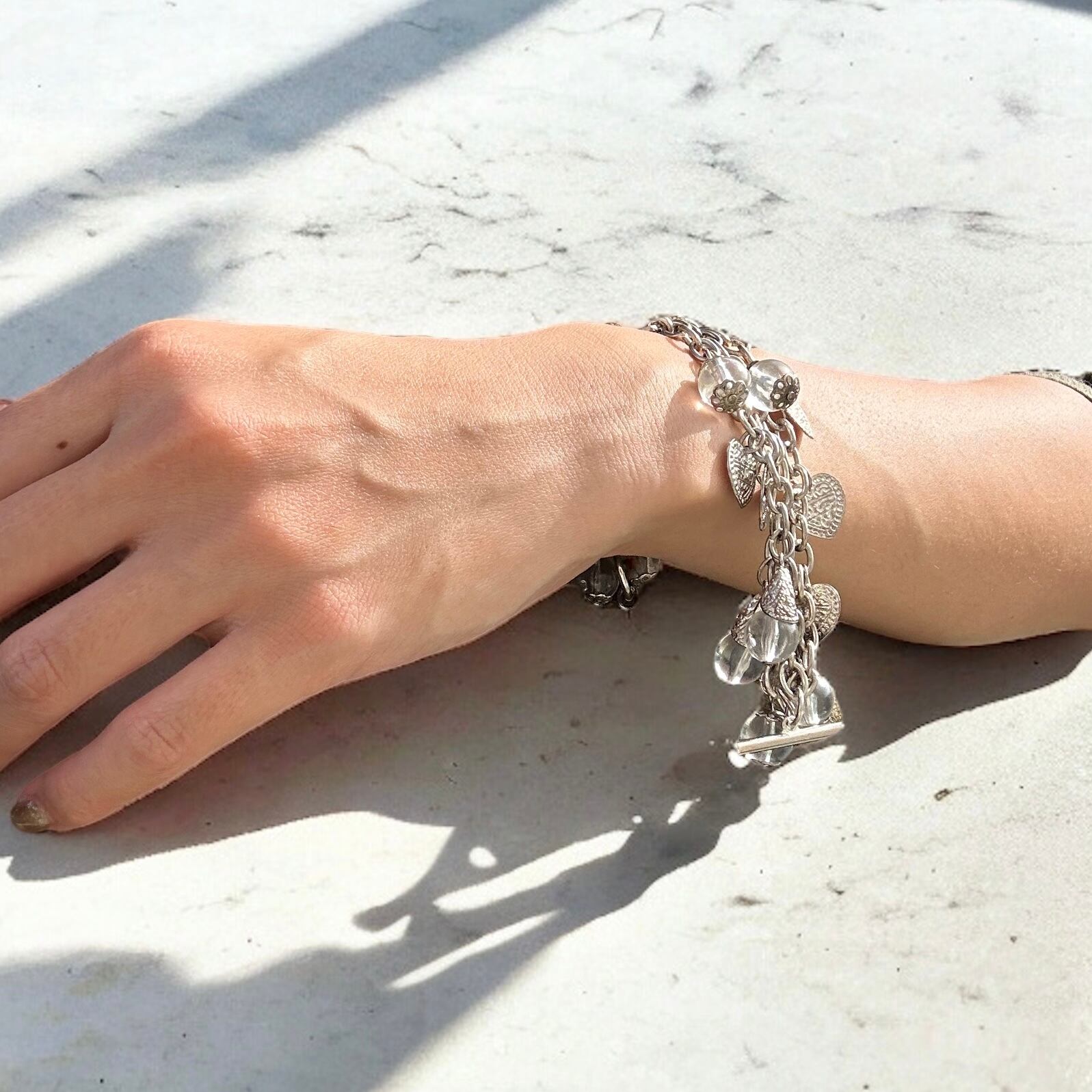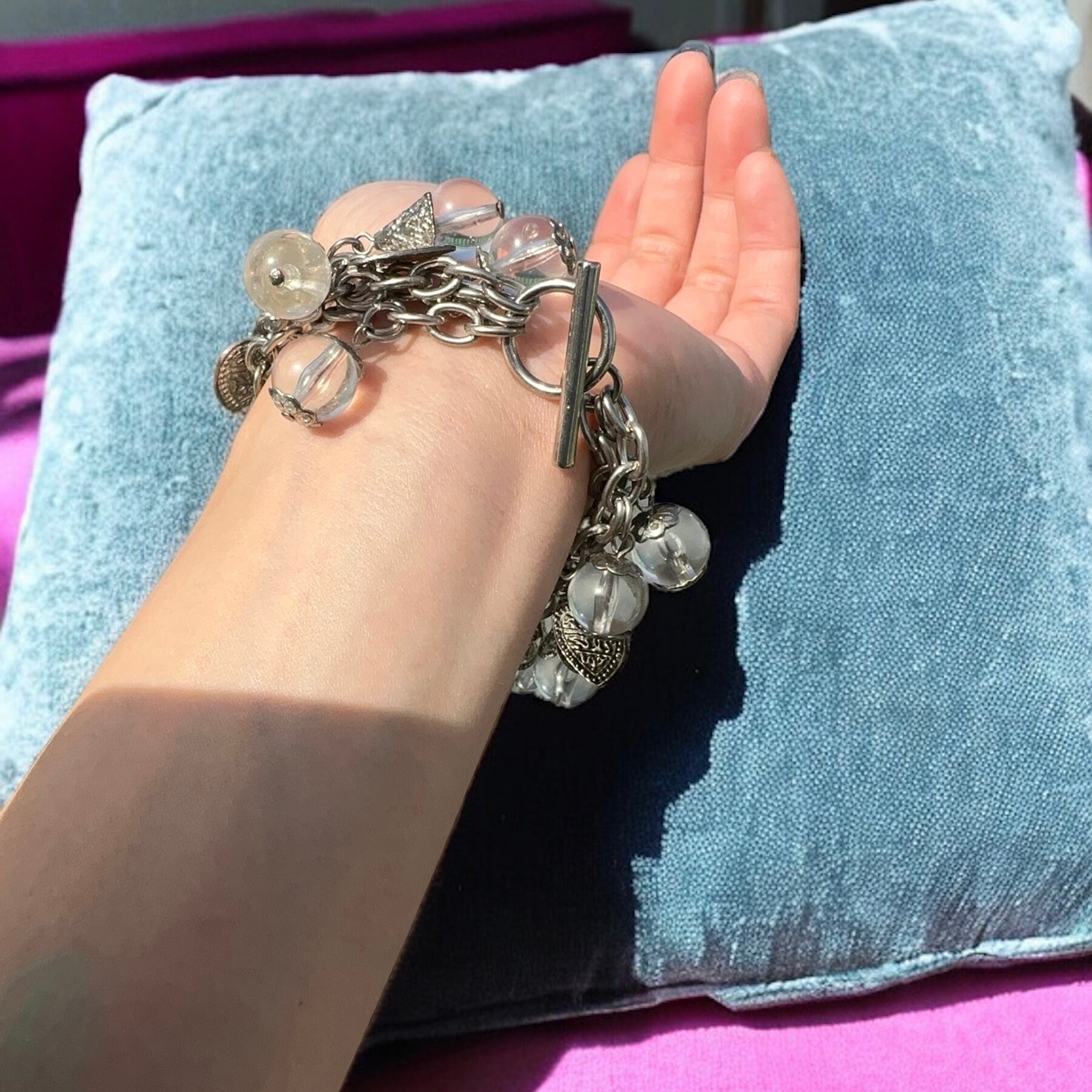 クリアボールとシルバーコインの組み合わせがおしゃれなアクセントとなり、手首を華やかに飾ります。軽やかなつけ心地でありながらも、しっかりとした作りは長くお使いいただけます。