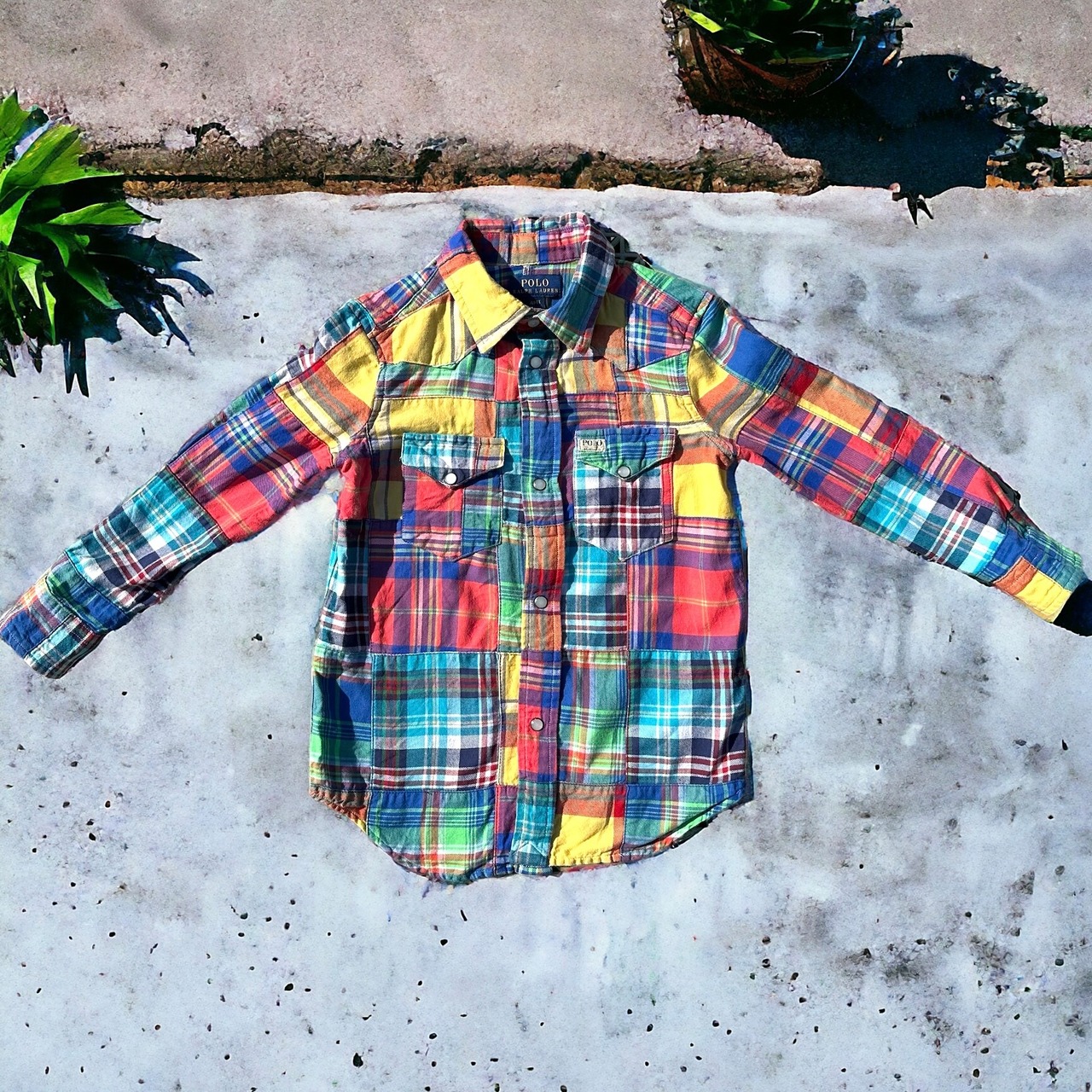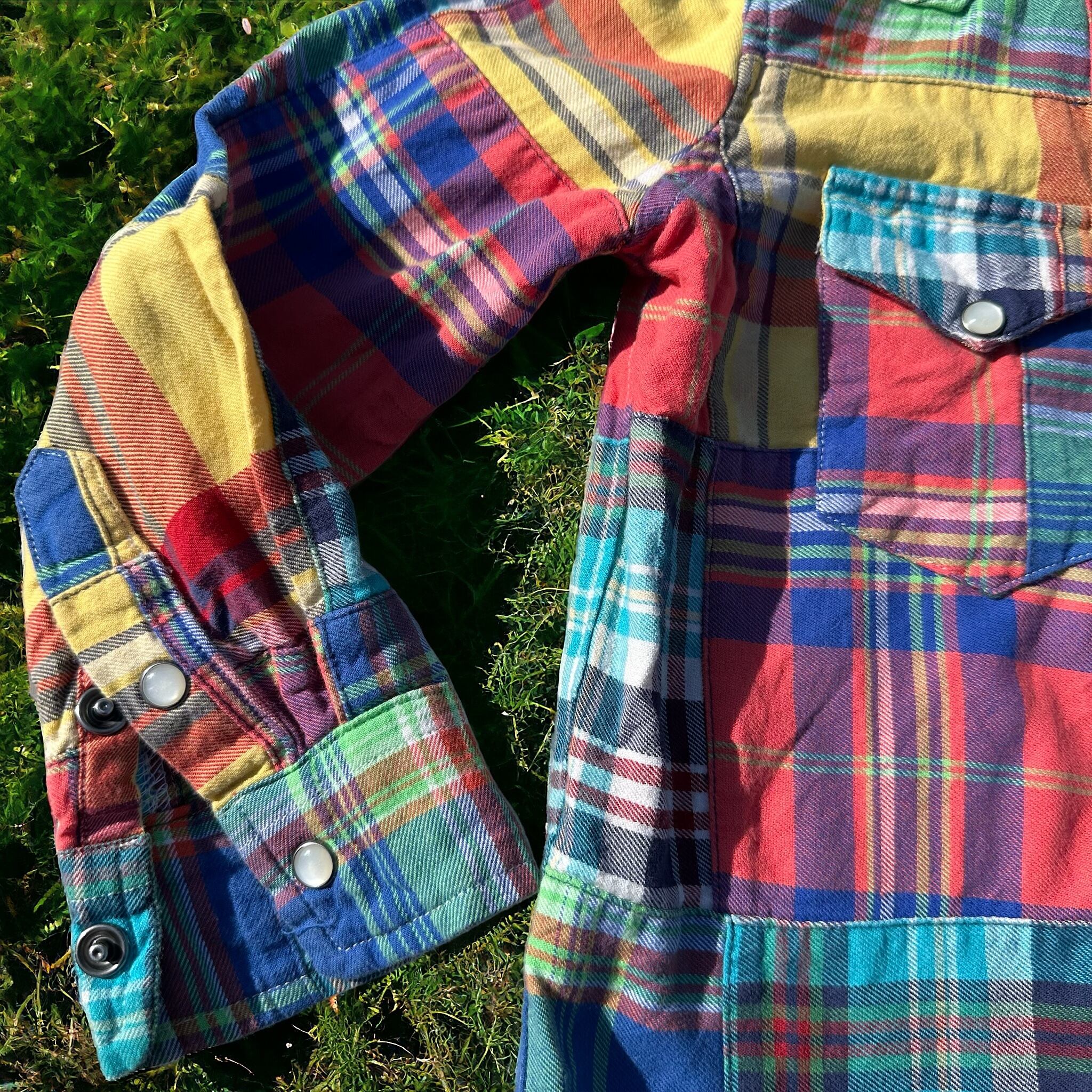 カラフルチェック柄のパッチワークシャツは、お子様の元気いっぱいな日常にピッタリですね!