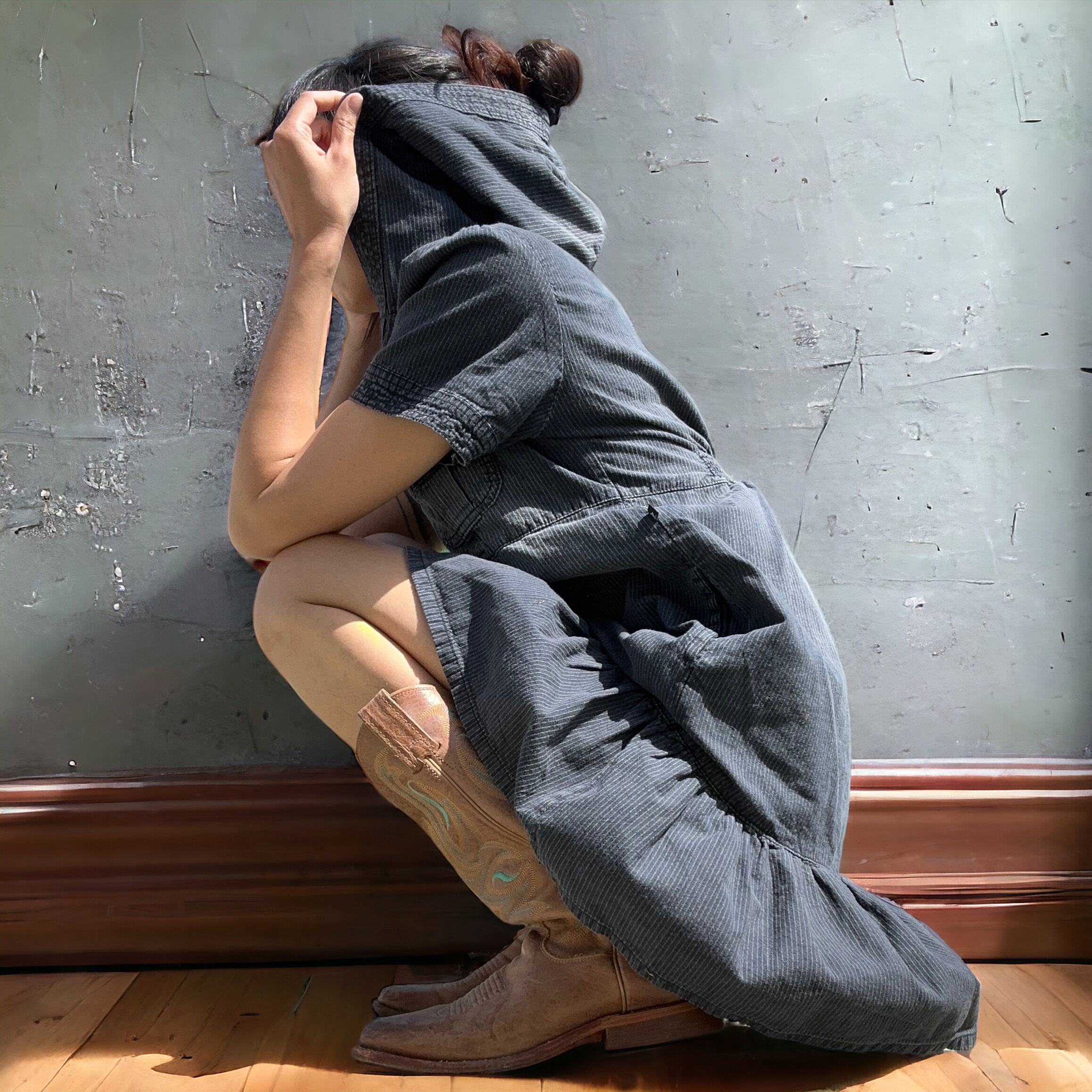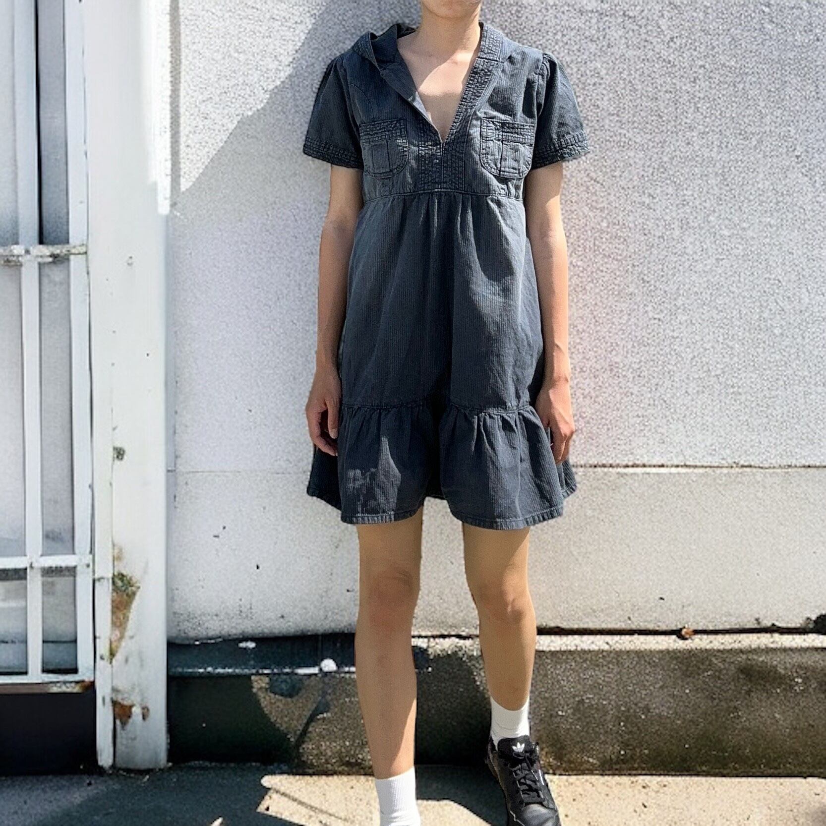 シンプルなデザインとヴィンテージライクな色褪せ加工が施された、お洒落なワンピースです