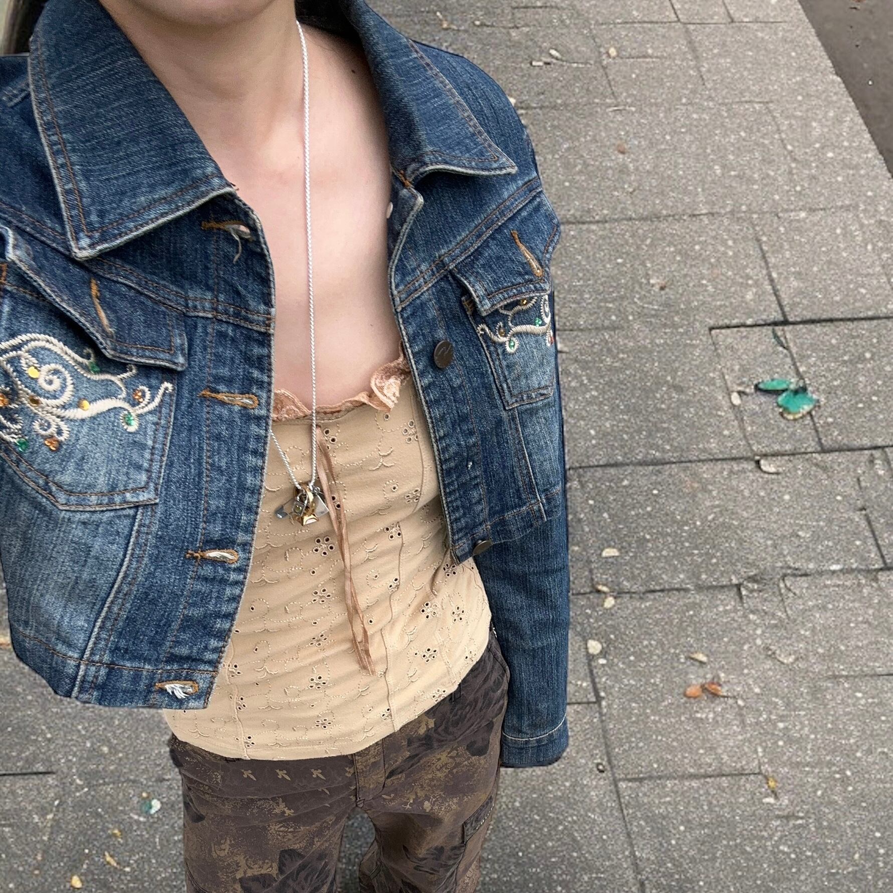 状態:薄いシミ数カ所あり/フロント部分真ん中のボタン外れ/デザイン的にラインストーンがやや取れやすいつくりです