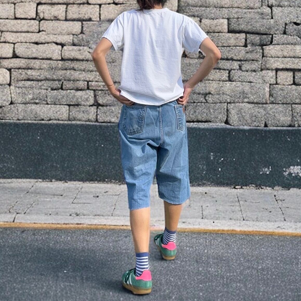 着用モデルサイズ:身長168㎝/51kg/骨格ストレート/肩幅広めのいかり肩/肩幅44㎝/二の腕周り25㎝/胸囲82㎝/ウエスト65㎝/ヒップ88㎝/太もも周り48㎝/股下78㎝