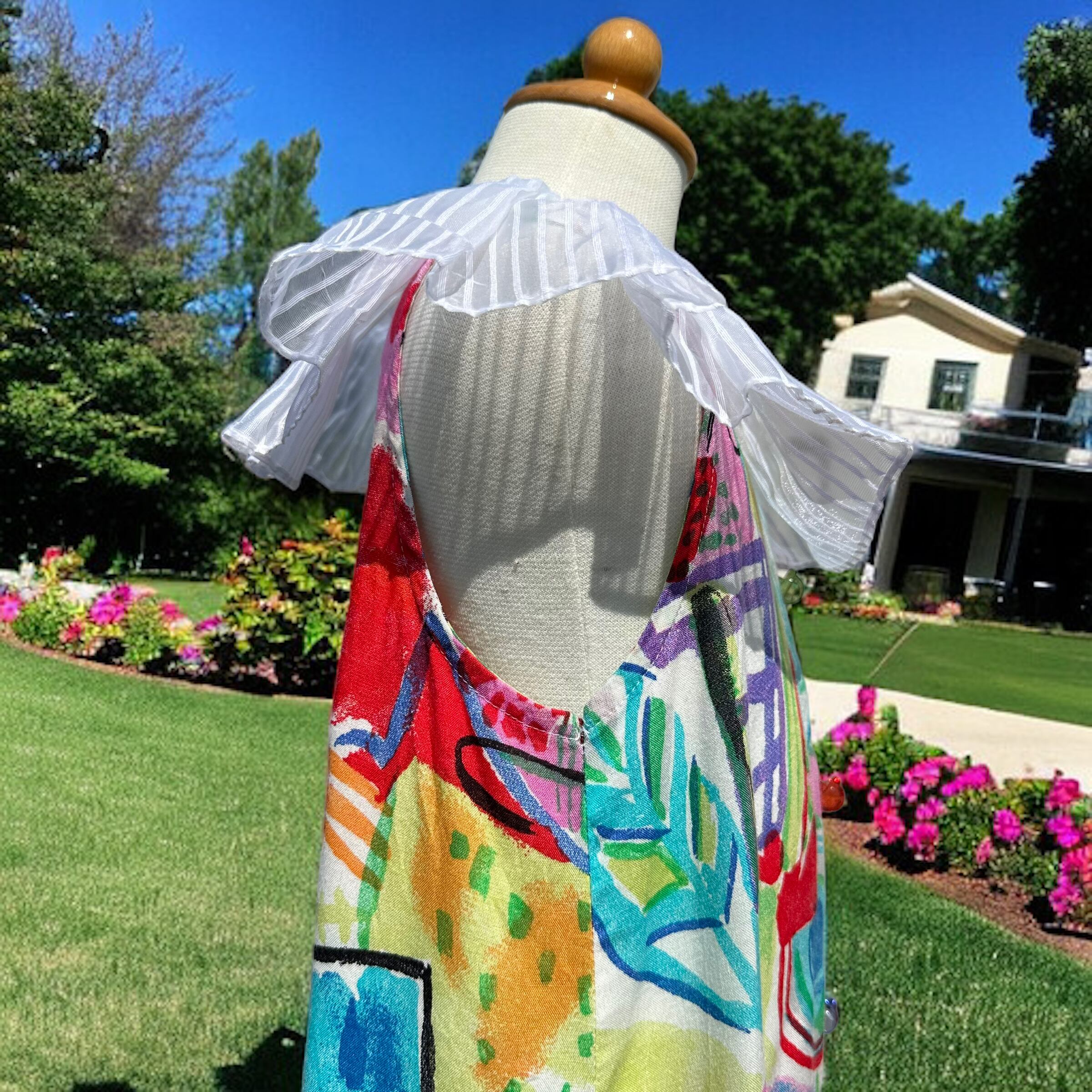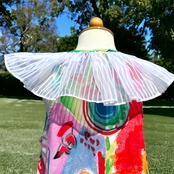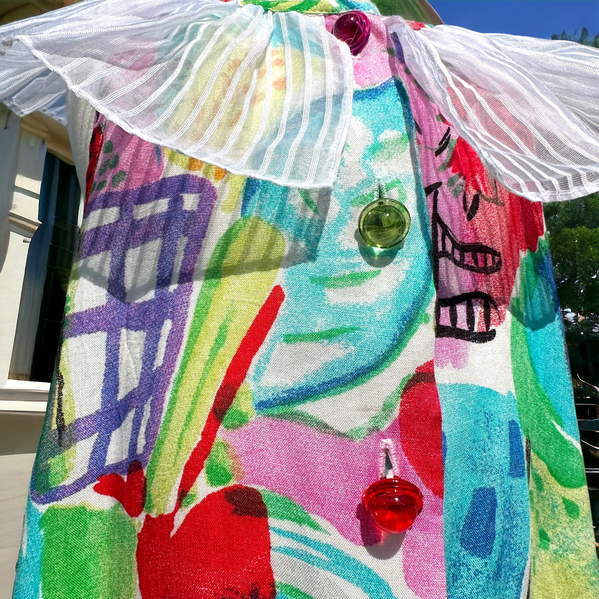 シースルーの襟元と、サラサラとした生地感のボディ、キラキラと光るカラフルなキャンディーの様なボタン!